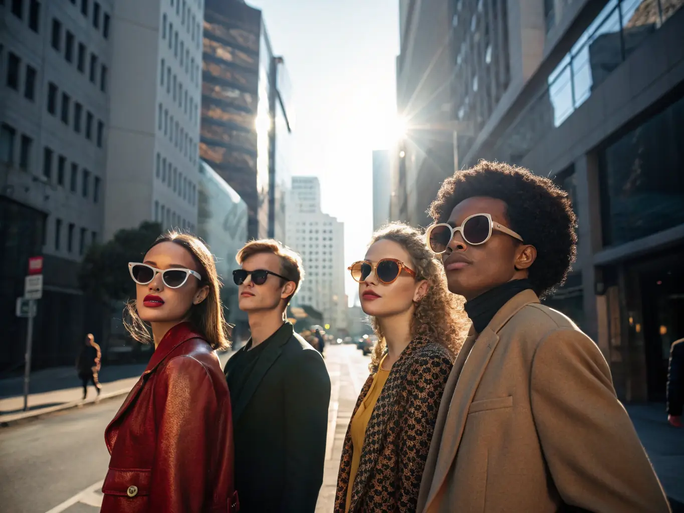 Models wearing trendy urban outfits featuring jackets, jeans, and accessories in a cityscape backdrop.
