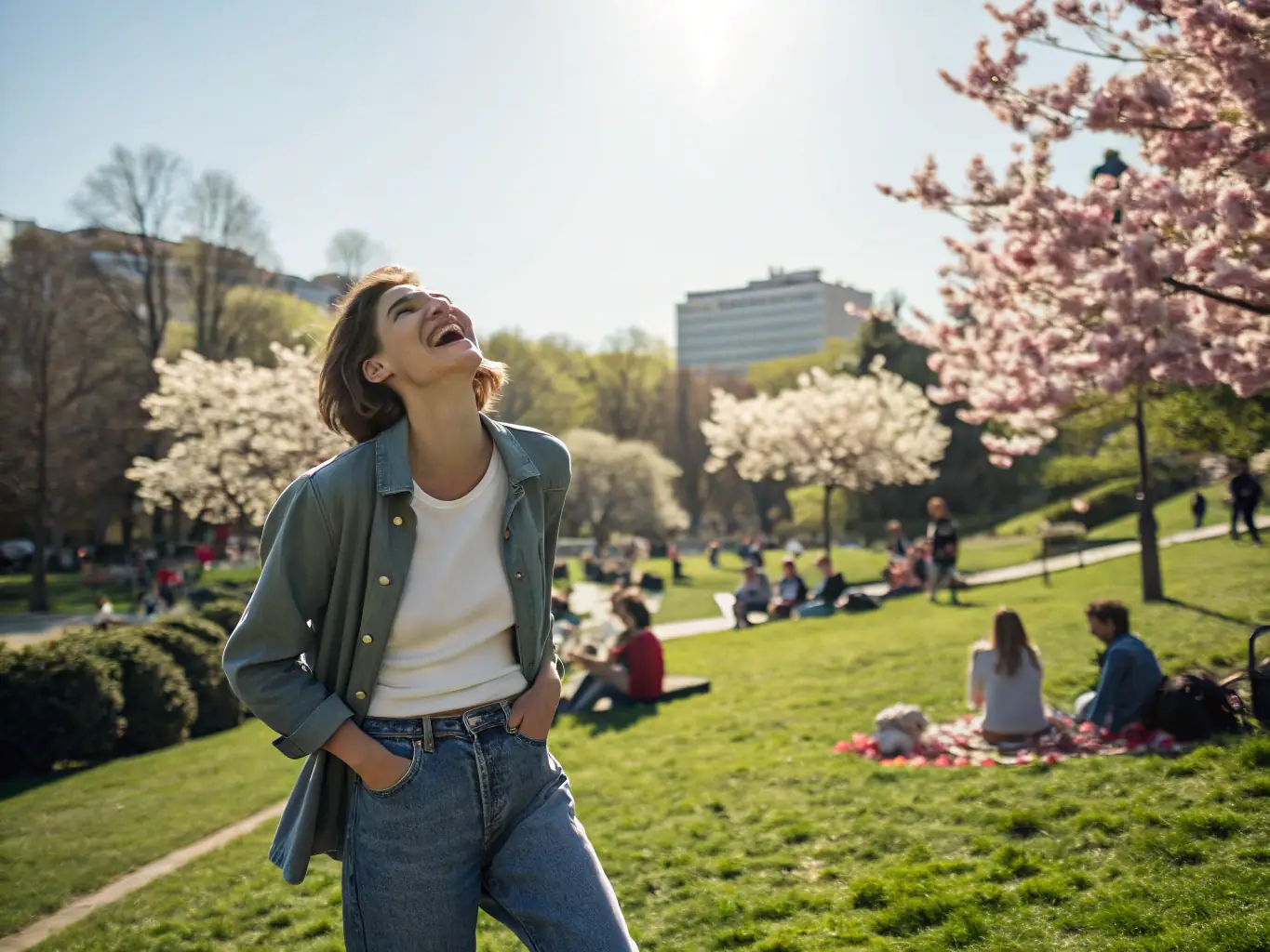 Models in light jackets, dresses, and accessories in a park setting with blooming flowers.